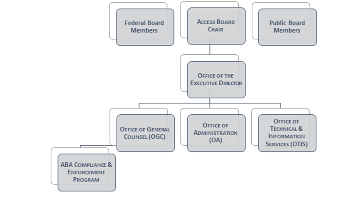 The Access Board is governed by a 25-member board, with the Board Chair serving as agency head. The figure below depicts the agency’s organizational structure in FY 2022.