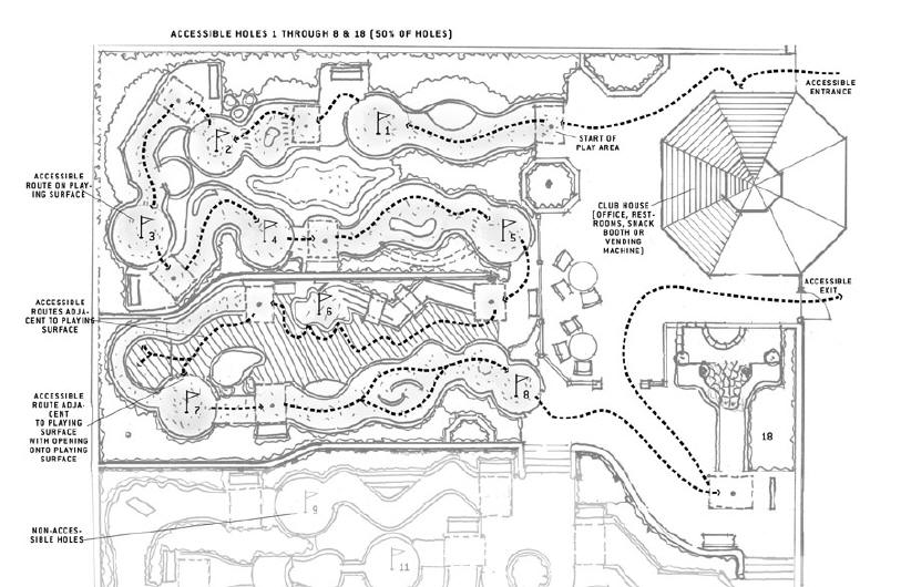 Accessible routes are continuous, unobstructed paths connecting all accessible elements and spaces of a building or facility. The accessible route must comply with ADAAG provisions for the location, width (minimum of 36 inches), passing space, head room, surface, slope (maximum of 1:12 or 8.33%), changes in level, doors, egress, and areas of rescue assistance, unless otherwise modified by specific provisions outlined in this guide. The accessible route must connect the facility’s entrance with the first accessible hole and with start of play area on each following accessible hole. The course must be configured to allow an easy exit from the last accessible hole to the facility exit or entrance. When not all holes are accessible, a player cannot be required to double back through holes to exit. Where possible, designers and operators are encouraged to make all holes accessible. An accessible route connecting accessible holes may be on the hole-playing surface or adjacent to it.