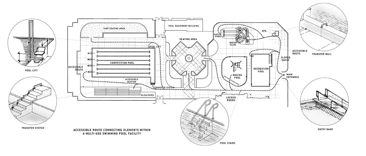 If swimming pools are part of a multi-use facility, designers and operators must also comply with ADAAG and all applicable requirements for recreation facilities. These include, but are not limited to: