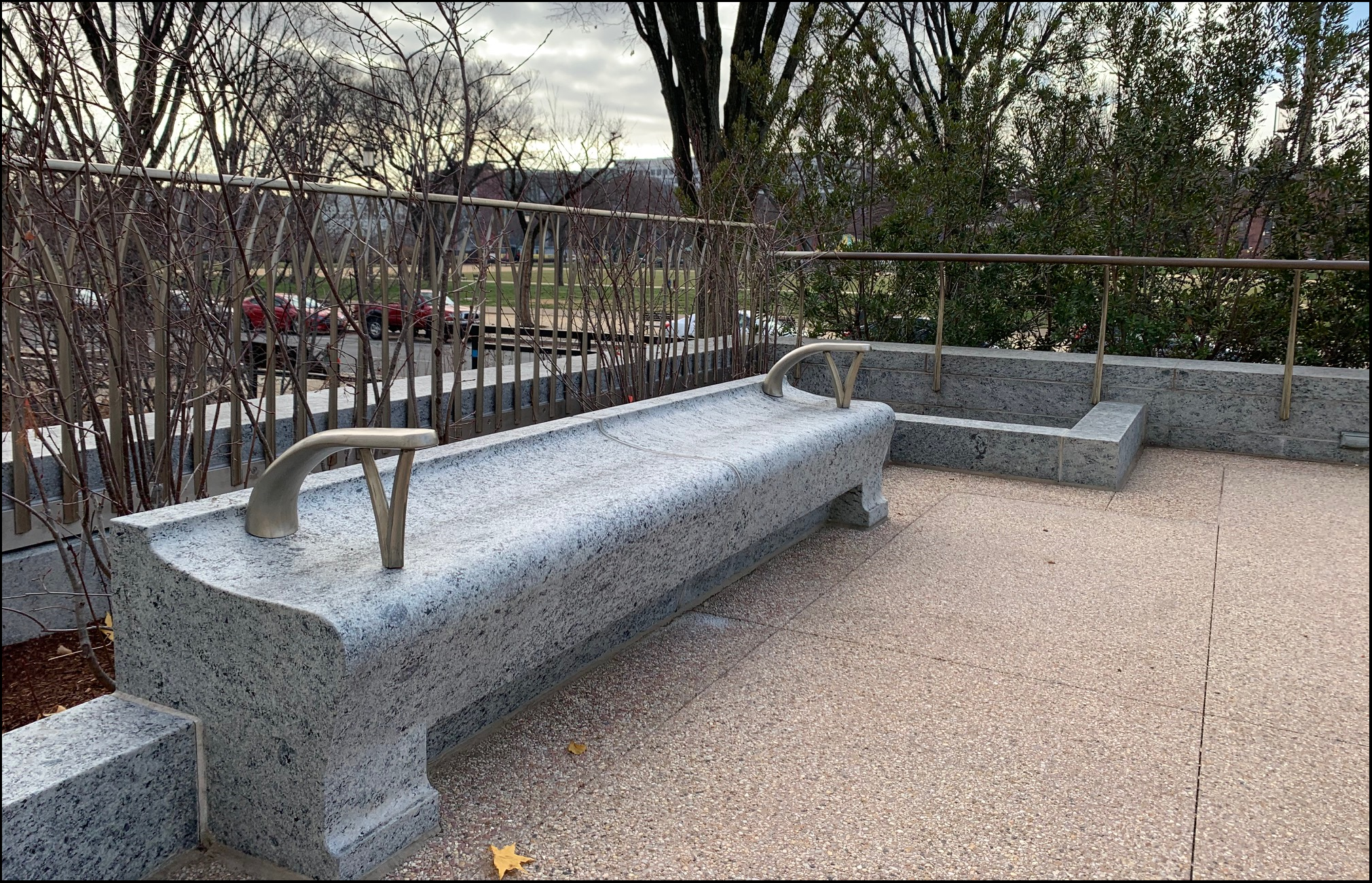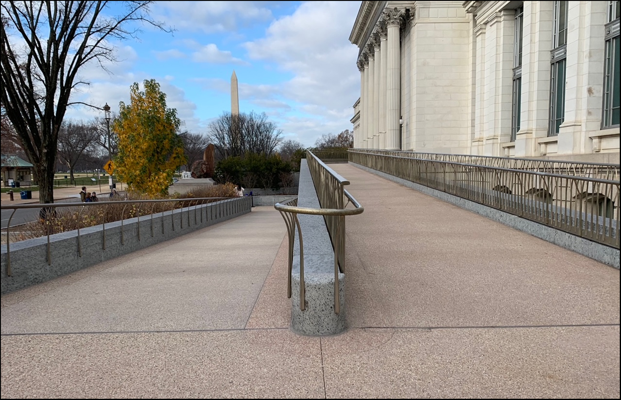 Previously, the museum entrance from the National Mall only provided a monumental staircase that caused those with disabilities to navigate around the large building to the Constitution Avenue entrance. But now the two new sloped walkways provide greater access to all museum patrons. The walkways are sloped between 1-3% and are eight feet wide, which permits space for two-way pedestrian traffic. The walkways also include bronze handrails and resting landings with a bench at the switchback turns.